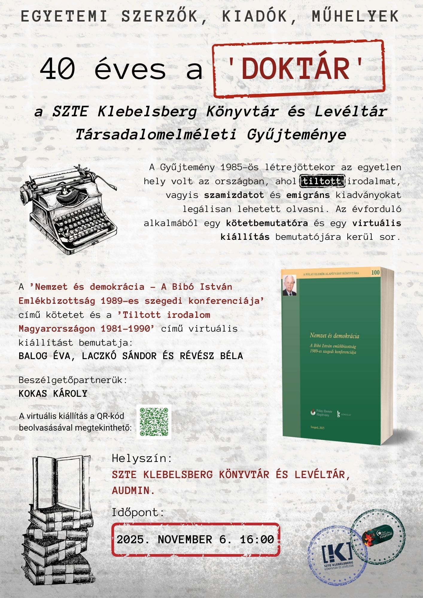 Az Egyetemi szerzők, kiadók, műhelyek sorozat következő rendezvénye: 40 éves a SZTE Klebelsberg Könyvtár és Levéltár Társadalomelméleti Gyűjteménye – a „DOKTÁR”