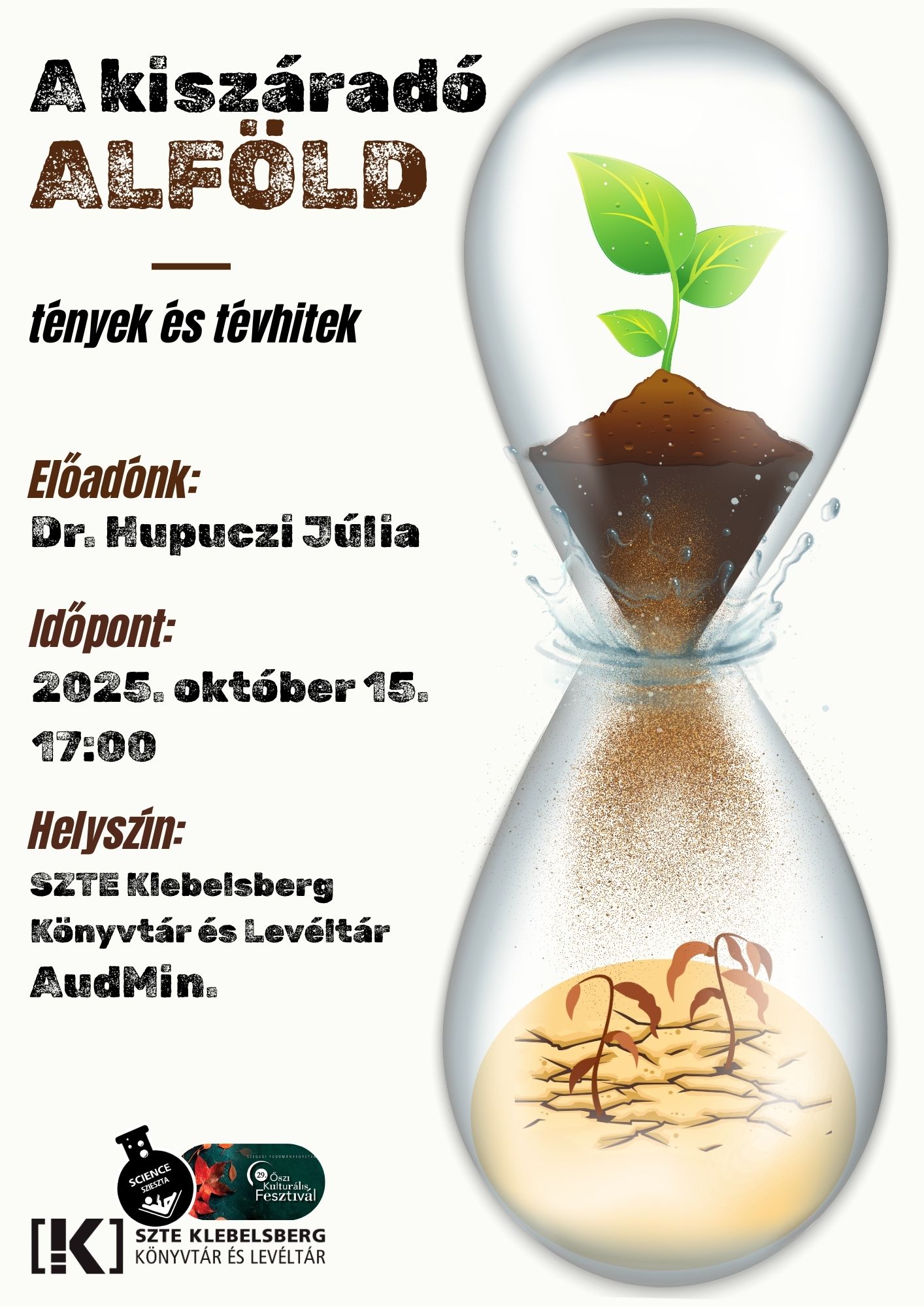 Az előadást Dr. Hupuczi Júlia, a Szegedi Tudományegyetem Mezőgazdasági Karának főiskolai docense tartja. Az Alföld kiszáradásáról szóló viták az elmúlt években a közbeszéd egyik központi témájává váltak. Gyakran találkozunk leegyszerűsített magyarázatokkal vagy szélsőséges véleményekkel, amelyek mellett nehéz tisztán látni a kérdés valódi összetettségét. Az előadás célja, hogy tudományos alapokra támaszkodva, közérthető módon mutassa be a jelenség hátterét.