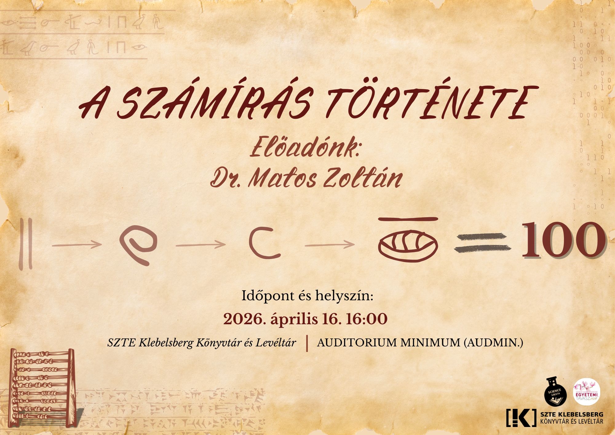 A „SCI-eszta polc bemutatja” sorozat következő alkalmán Dr. Matos Zoltán, az SZTE Báthory István Gyakorló Gimnázium és Általános Iskola oktatója tart előadást A számírás története címmel.