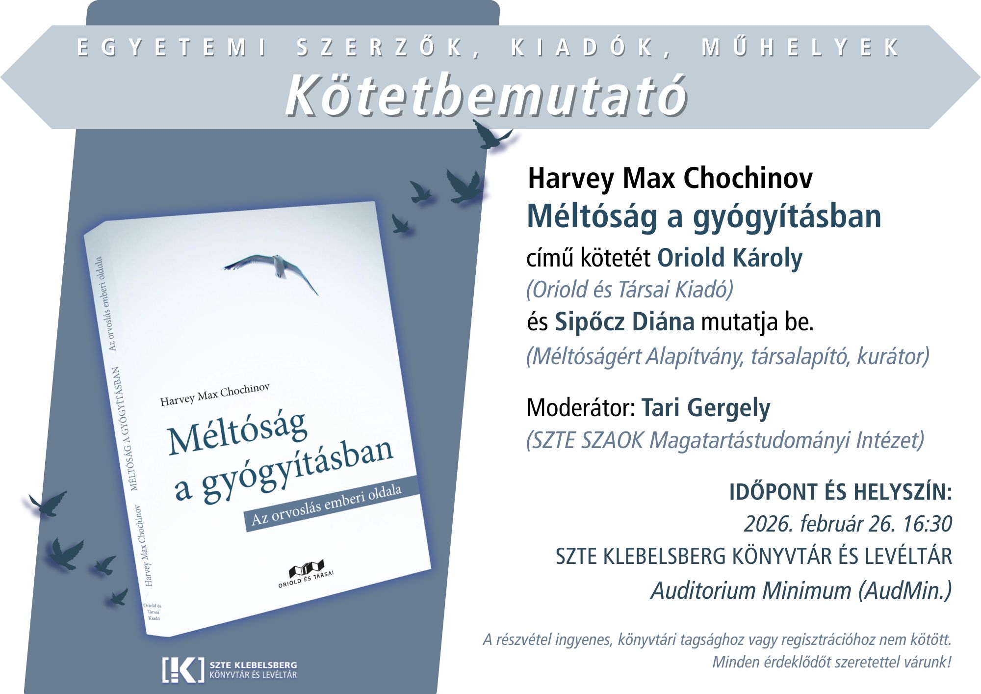 Az „Egyetemi szerzők, kiadók, műhelyek” sorozat keretében kerül sor Harvey Max Chochinov: Méltóság a gyógyításban című kötetének bemutatójára.