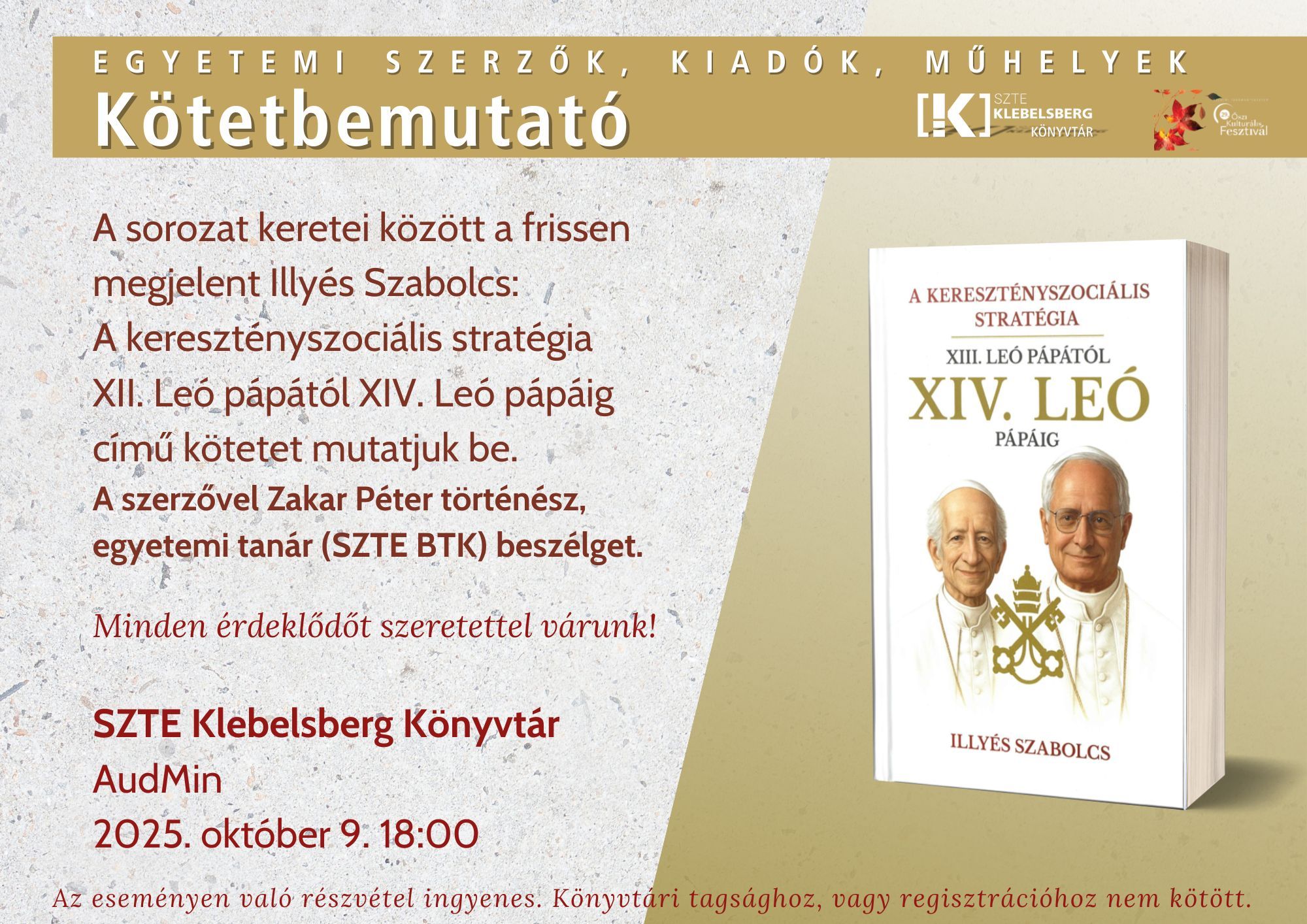 Hogyan tud a keresztényszociális gondolat érvényesülni korunkban? Milyen válaszokat tud adni a 21. századi társadalmi, etikai és vállalatirányítási kérdésekben a világ számára az újonnan megválasztott vezetővel, XIV. Leóval az élén a Vatikán? Érvényes-e az egyházfők a politika világára vonatkozó iránymutatása korunk politikai koncepcióival összevetve? A Fons Press kiadónál frissen megjelent kötetben Illyés Szablocs, az SZTE JGYPK történész-teológus oktatója, kutatója ezekre a kérdésekre kereste a választ.