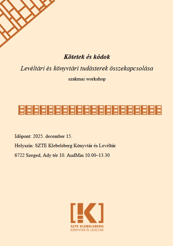 A „Kötetek és kódok” című szakmai workshopot az SZTE Klebelsberg Könyvtár és Levéltár szervezi, a 2025 nyarán létrejött közös intézményi szervezeti egység első nyilvános szakmai alkalmaként. A rendezvény célja, hogy bemutassa a közgyűjteményi szférában megjelenő új technológiai megoldásokat, valamint elősegítse a levéltári és könyvtári munkafolyamatok összehangoltabb megértését és átjárhatóságát.